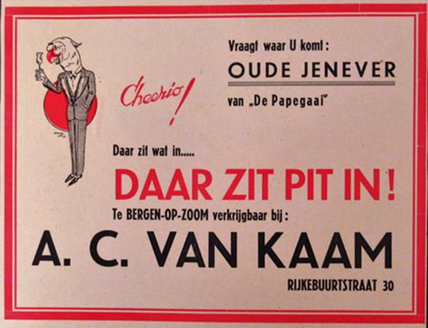 Dit verhaal is een samenvatting van het verhaal Reclame – vormen te Bergen op Zoom van de distilleerderij en alcoholfabriek de Papegaai vh. Van Berkel & Co. Te Delft. ( door Kruf en Jordans).